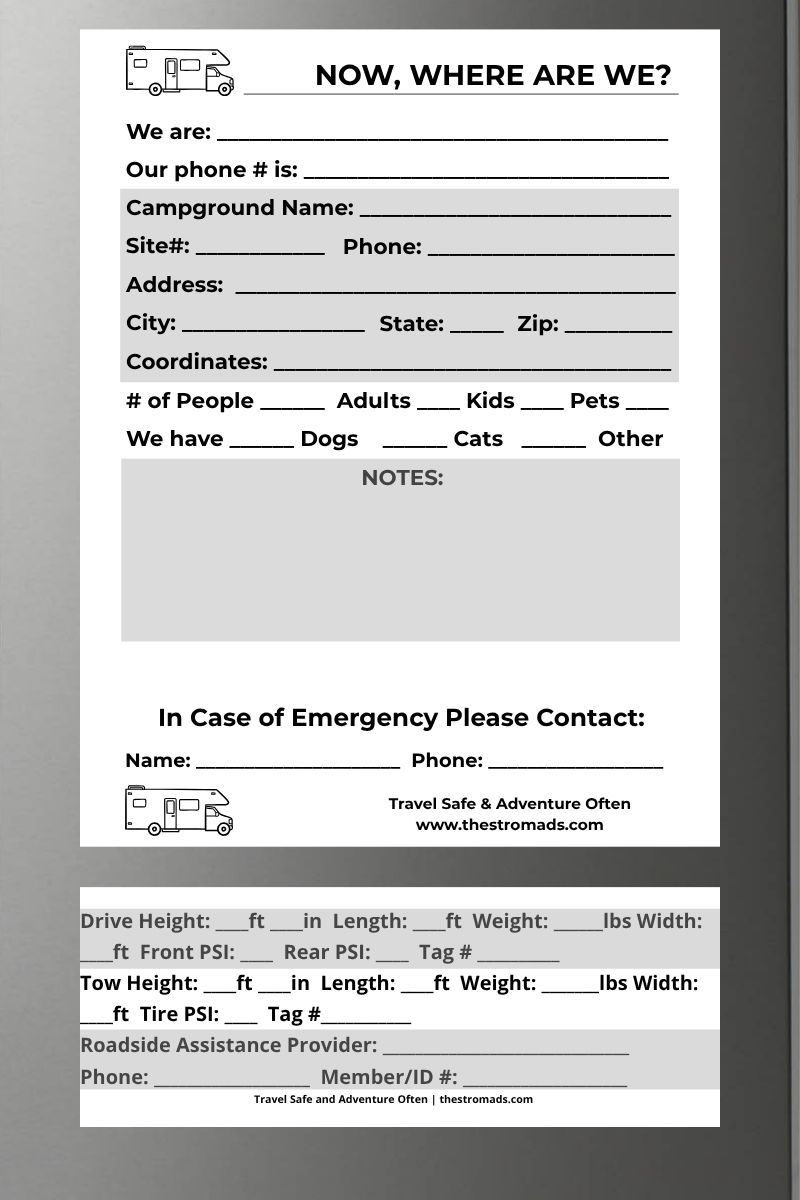Stay ready on every trip with our two-piece RV safety set: emergency contact fridge stickers and a windshield specs sticker. Keep your location, contacts, and rig numbers at a glance so calls go faster and driving feels calmer.
